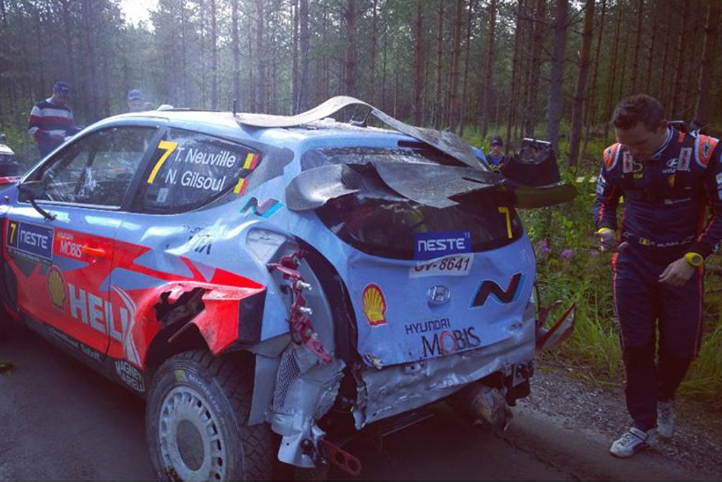 WRCラリーフィンランドは7月30日、ルーヒマキのステージ(4.62km)でシェイクダウンが行われた。この1本目の走行フィニッシュ間近で、ティエリー・ヌービルが高速の左コーナーでクラッシュ。木をなぎ倒したヒュンダイi20 WRCのダメージは大きく、ただちにユバスキラのサービスパークに戻され修復作業が始まった。