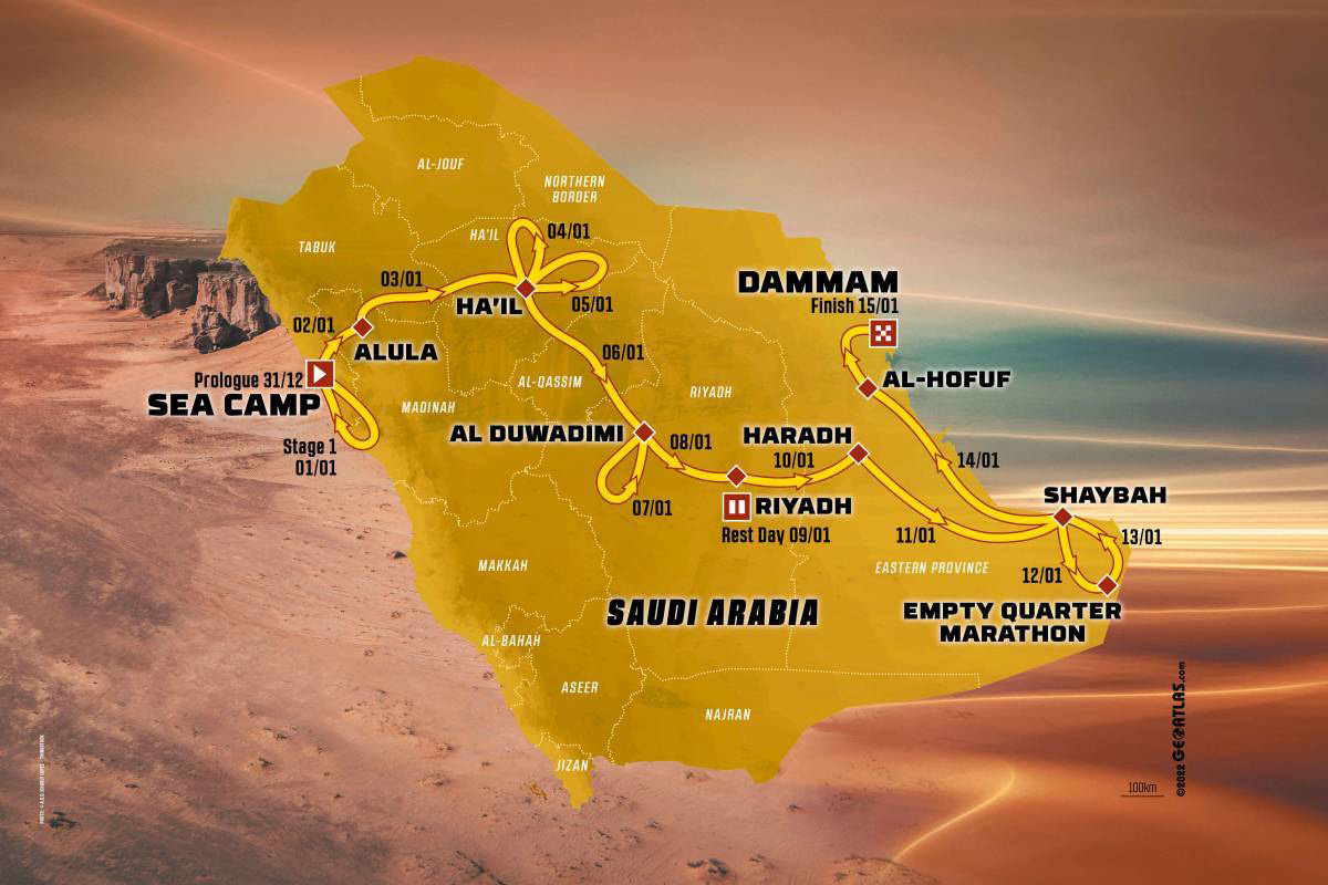 競技は、2022年12月31日に紅海のシーキャンプでプロローグランとステージ1の走行でスタート。サウジアラビア大会ではおなじみとなったアルーラ、ハイル、リヤドを通過し、1月9日にリヤドで休息日を迎える。広大な砂漠地帯のエンプティ・クオーターではマラソンステージを含む4日間を過ごすことになり、14ステージ、5000km近くのルートは1月15日、アラビア湾沿岸のダンマームでフィニッシュを迎える。